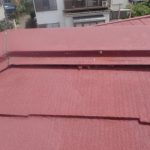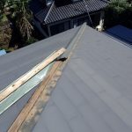 飛散を免れた棟板金を見ると、継ぎ目に充填されたシーリング材が劣化しているのがわかります。また、板金を固定している釘に浮きや抜けが見受けられました。この部分の貫板も腐食や劣化が進んでいる可能性が高い為、今回は屋根全体的な棟板金交換工事をご提案しました。