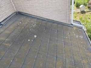 スレート屋根はセメント質で形成されていますので、水を吸ってしまわないように表面に焼付塗装を施してあります。しかし、経年劣化が進んでしまうと撥水効果が切れてしまい写真のように苔やカビが繁殖してしまいます。特に日当たりの悪い場所に発生しやすく、苔は種類によって太陽光が嫌いでないものもたくさんあり、どんな場所でも繁殖してしまいます。苔やカビが発生している状態の屋根を放っておきますと雨漏りを引き起こす原因になります。雨漏りを引き起こすと家の内部の木材の腐食や屋根裏のカビの発生、シロアリの発生につながります。