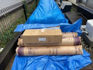 表面の剥離している状況の既存屋根「パミール」の状態です。塗装をしても長く持たない事はこの状況からも判断出来ます。よってカバー工法によるメンテナンスとなりますが、先ずは粘着式の防水シートの敷設から施工がスタート致します。