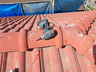 既存の棟瓦は再利用出来ますので適正に戻しビスでしっかりと固定いたしました。