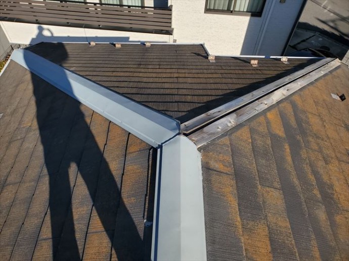 松戸市小金原で台風による強風の影響により棟板金が飛散したスレート屋根調査、棟板金交換工事をご提案