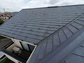 屋根材にひび割れや欠けが発生していました。傷みが顕著ですので確認すると通常のコロニアルではなくコロニアルNEOだという事が分かりました。一昔前の屋根材は耐久性を保つためにアスベストを使用していましたが、健康被害が社会問題になりましたのでアスベストは屋根材に使用されなくなり、各メーカーがノンアスベストの屋根材を生産したうちの一つがコロニアルNEOになります。生産当時はアスベストを使用することなく強度を保つ技術がまだ無かったためコロニアルNEOは耐久性が低く劣化の進行が早い屋根材となってしまいました。