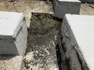 それではお客様のご自宅にお伺いし調査を行います。屋上に上がると屋上にある排水溝がすべて詰まってしまっていました。長年の泥が詰まってしまい排水溝を塞いでしまっていました。そのことにより雨水が流れずに溜まってしまっていました。常に満水状態ですので雨が降ると溢れて漏れてきてしまっていた状態です。
