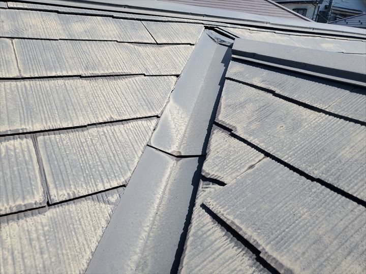 谷周辺のスレートが欠けています。スレートは雨水を吸収すると膨張し、乾燥すると収縮しますのでスレートには負荷が生じます。屋根が色褪せてきたら塗膜で保護する為の屋根塗装工事を行う事で耐久性の保持に繋がるのですが、定期的にメンテナンスを行わないと膨張と収縮を繰り返し、負荷に耐えられなくなると耐久性が低下してしまうのです。