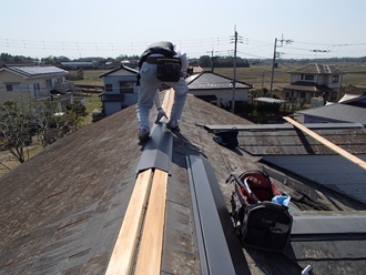 既存の棟板金は全て徹底を行い新規材の貫板と棟板金包みを使用致します。既存の貫板は釘で固定しておりましたが、しっかり固定する為にビスを使用致します。