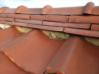 棟の土台になっている葺き土が崩れてきています。葺き土が崩れると棟自体の崩壊に繋がり、棟ののし瓦や冠瓦の落下に繋がり大変危険です。また、瓦が落下する際に周囲の瓦に干渉すると衝撃で割れてしまい二次被害に繋がります。
