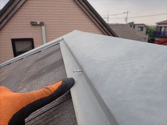 棟板金の調査の様子です。棟板金を固定している釘の浮きを発見しました。棟板金は屋根の山状になっている部分に設置されているため風の影響を受けやすいので固定している釘が浮いてきてしまいます。また、棟板金の下地材には木製の貫板が使用されている事が多いので、貫板が劣化すると固定する力が弱くなりますので釘が浮いてくる原因になります。釘が浮いてしまうと棟板金を固定する力が弱くなり台風などの強風や突風の影響で飛散してしまう事に繋がります。お客様に調査のご報告をし、築25年という事を考慮すると防水紙のメンテナンスも必要ですので既存の棟板金を解体し、新しい屋根を被せる屋根カバー工事のご提案を致しました。スレートのひび割れによる雨漏りを未然に防げる事や棟板金の飛散も防げます。