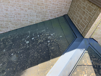 まず、2階の屋根もそうでしたが、屋根全体の塗膜が劣化してしまっています。また、塗装によるメンテナンスを怠っていた為に屋根全体に苔やカビが発生してしまっています。コケやカビが発生してしまう原因としては、塗膜が劣化してしまうことで水の流れが悪くなり屋根材が水を吸収するようになってしまいます。そうすることで屋根材にコケやカビが発生しやすい状態となってしまいます。このような状態では屋根材が水を吸収し屋根材自体が劣化してしまいます。屋根材が劣化してしまうと割れや欠けが発生しやすい状態となってしまいます。