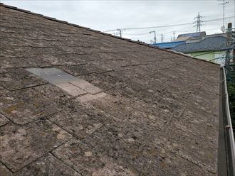 調査の様子です。梯子を使い屋根に上がると屋根の各所に飛散している箇所を発見しました。屋根材はアーバニーという屋根材で現在は廃盤品になっております。現在は規制が掛かり販売中止となっている石綿スレートの一つでデザイン性に優れていますが、デメリットとして割れやすいので強風や突風の被害に遭いやすい屋根材になります。