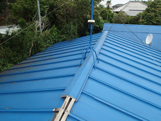 こちらは増築された建物の屋根です。瓦棒と呼ばれる金属屋根材が使用されておりました。頂上に設置された棟板金が一部、飛散していましたので、早急な補修工事が必要です。屋根葺き替え工事と一緒に、増築建物の棟板金交換工事もご提案させて頂きました。