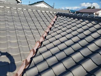屋根全体を調査すると桟瓦が割れているのを発見しました。お問い合わせをいただく直近で強風が吹いたり、地震がありましたのでその影響によるものだと考えられます。瓦が割れてしまうと割れた箇所から雨水が浸入してしまい、瓦の下に敷設されている防水紙の劣化を早めてしまいます。このままですと防水紙の穴あきや捲れに繋がり、雨漏りの原因になってしまいますので早めの対応が必要になります。