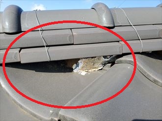 漆喰が剥がれており棟の土台の葺き土が露出していました。漆喰は防水の役割も果たしておりますが剥がれてしまうと葺き土が雨水に晒されてしまいます。葺き土に雨水が浸透してしまうと浸透した雨水が建物内部へと浸入してしまいますので雨漏りの原因になってしまいます。このままですと雨漏りが発生してしまいますので漆喰詰め直し工事や棟取り直し工事が必要になります。