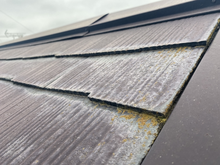 棟板金は問題ございませんでしたが、スレート屋根自体の経年劣化がありました。色あせがありメンテナンスの時期でしたのでご検討された方がいいかと思います。数年前に屋根塗装工事を行っておりましたが屋根の隙間が埋まってしまい放置すると雨漏りを引き起こしてしまう状態でした。
