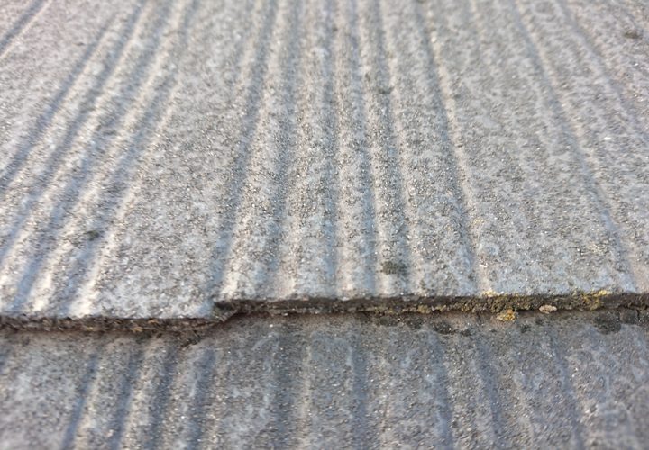 全体を見ていきますと、割れてしまったり反れが発生しているスレート材はまだありませんでした。ですが表面を保護している塗膜が劣化しており、所々に雨水を吸ってしまっているような変色や、苔の繁殖が目立つ状態でした。