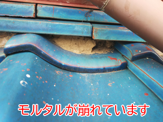 棟に詰められたモルタルは瓦を固定するという役割の他にも、屋根内部へ雨水が入り込まないようせき止めるという役割も担っています。ひび割れが発生している場合はその隙間から雨水が侵入してしまう恐れがあり、そのまま内部へ雨水が滞留すると雨漏りが引き起こされます。