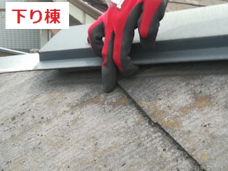 建物の形状は寄棟タイプで、大棟の棟板金と下り棟(隅棟)があります。下り棟と大棟の接合部分にはコーキング(シーリング)処理が施されていますが、劣化により一部剥がれていました。また、下り棟(隅棟)の軒先近くでは、釘の固定が弱まり棟板金が持ち上がってしまう状態でした。この状態では、台風などの強風により棟板金が捲れあがってしまう恐れがあります。