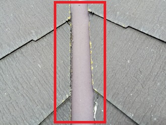 太陽光パネルが設置されていない面の屋根となりますが、ヒビ割れが多く発生している状態でした。まだ築12年近くとのことでしたので、状態が悪化していかないうちに早めのメンテナンスが必要です。別の箇所も確認していきます。