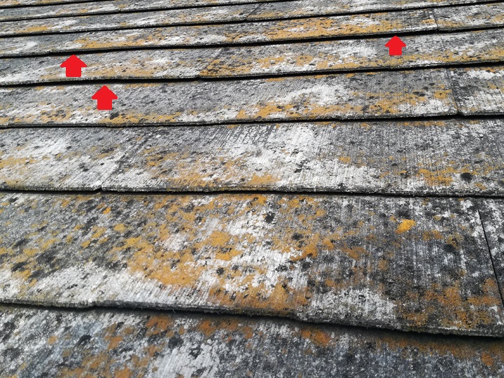 スレート材が反ったり歪むなどして、屋根材と屋根材の隙間が通常よりも大きくなっている箇所が見受けられました。塗装が剥がれ、屋根材が直接水分を含みやすい状態になっています。白っぽく見えるのは、スレート材の素地(そじ)です。スレート材が「水分を含み膨張」➡「乾燥して収縮」を繰り返すことで、ヒビが入りやすくなったり、反りが発生しやすくなります。