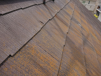 まずは傷みを気にされておりましたスレートの状態から確認いたします。スレート表面は全体的に色褪せが発生しており、苔や汚れの付着もかなり目立つ状態でした。これはスレート表面を覆う塗膜が劣化し、雨水が弾けなくなったことで防水性が低下しているサインとなります。塗膜は防水性の維持や紫外線の影響を抑える効果がありますので、劣化してしまうとスレート自体の傷みに繋がってしまいます。