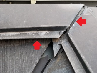 棟板金が端側の方に向くにつれて浮いている状況で