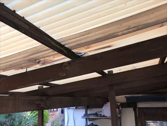 こちらの波板は数十年メンテナンスを行っていないとの事でした。現地調査にお伺いいたしますと波板の穴あきや波板を固定するフックボルトも腐食が進んでおりましたので固定力も低下してしまい強風などで