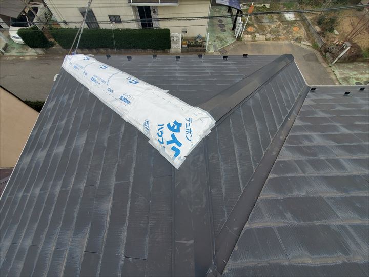 千葉市宮崎町で昨年屋根の塗装工事の様子です。スレート屋根の経年劣化が進んでおり屋根塗装工事をご検討されておりました。足場を建て工事を行なうので長期保証の工事をご希望でしたので、日本ペイントさんのサーモアイ4Fを使用した屋根塗装工事をさせていただく運びとなり