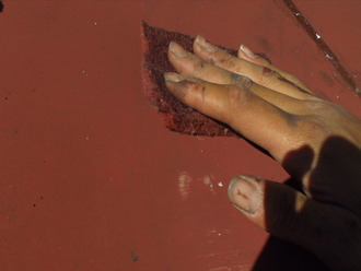 梯子を使い屋根に上がると、経年による劣化により塗膜が剥がれて色褪せていました。スレートは塗装で保護されてお