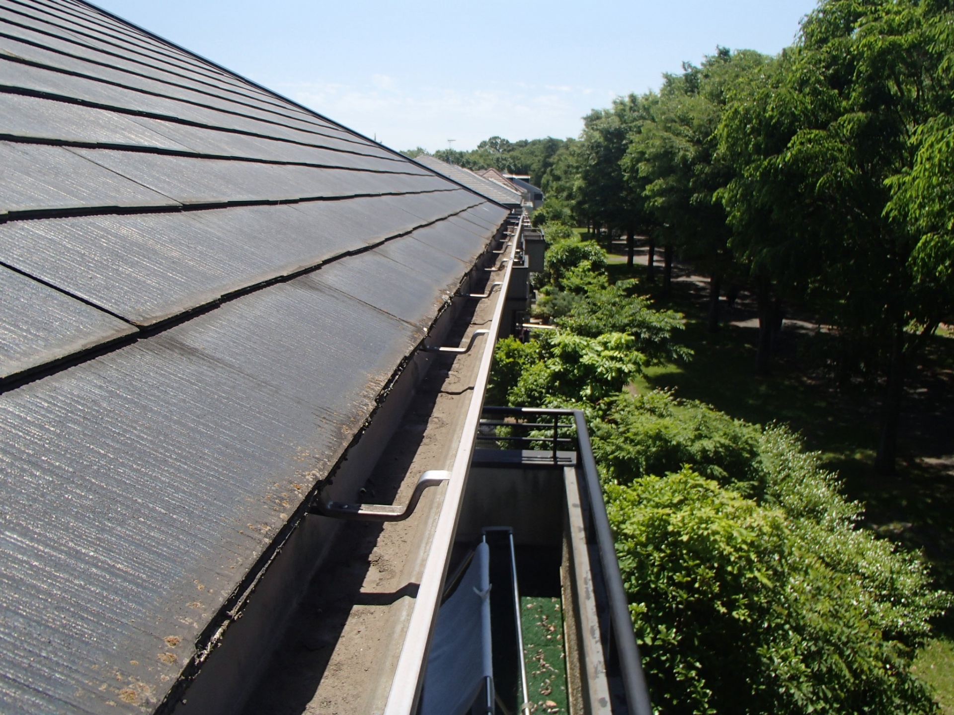 台風15号の影響で棟板金が飛散したスレート屋根の調査