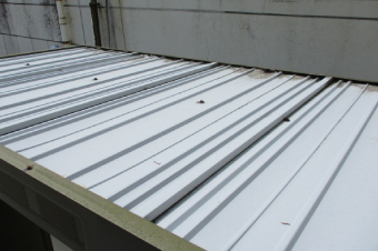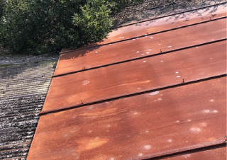 こちらは、作業小屋として利用されている建物だそうです。屋根全体に真っ茶色の錆びが見られます。今ある屋根の撤去が難しいプレハブ構造でした。そこで、新しい屋根を覆っていくカバー工法での修理をご提案させていただきました。