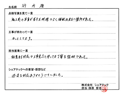 工事が終わって一言 ほっとしてます。 担当営業に一言 誠意ある対応で工事完了に伴っても丁寧な説明であった。 シェアテックへの要望・感想など 迅速な対応ありがとうございました。