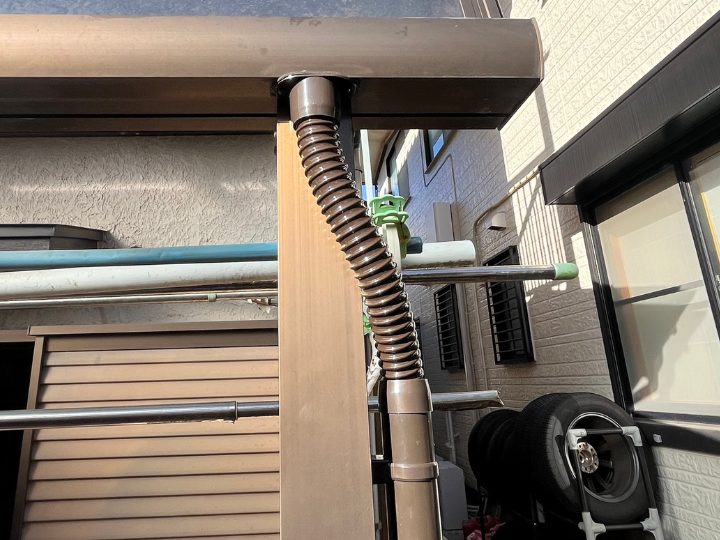 お客様ご自身でホームセンターに部材を探しに行ったものの雨樋のジャバラ配管は一般的な流通品ではサイズが合わず、修理が困難であることを実感されたとの事。