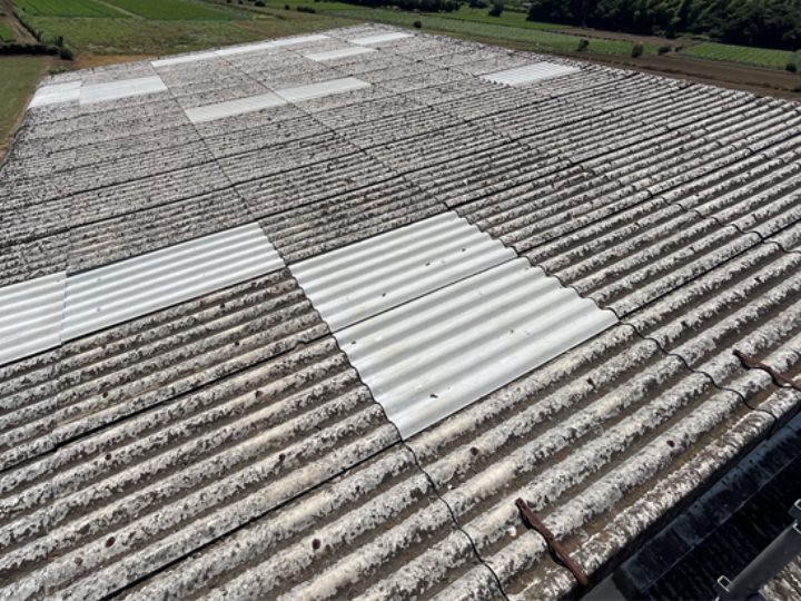 屋根材に使用されている大波スレートの素材を確認したところ、アスベストが含まれていることが判明しました。
