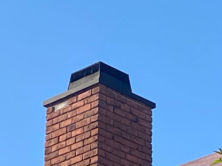 続いて屋根へ上り、煙突の外部を細かくチェックしました。煙突はレンガで囲われ、頂部に金属製の角トップが取り付けられています。