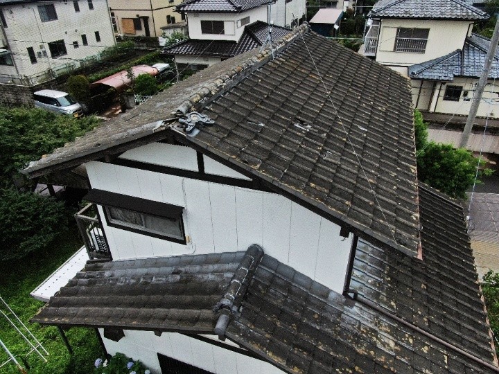 点検のため屋根に上ると、棟瓦は破損しており、築年数の経過から瓦屋根全体が劣化している状態でした。