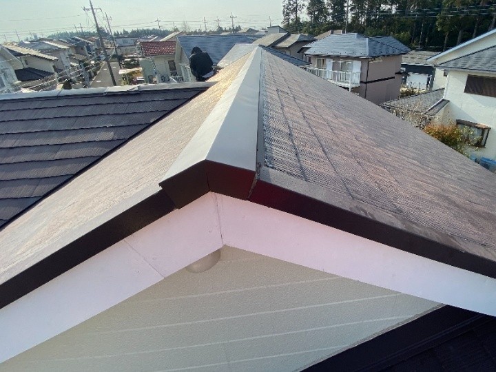 今回の施工では、経験豊富な職人が棟板金を適切に加工しており、雨水が入り込みにくい仕上がりとなっています。