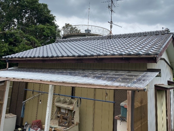 お客様のご自宅は平屋ですが、敷地内に別邸があり、台風の強風によって母屋の瓦が飛ばされていた状況でした。