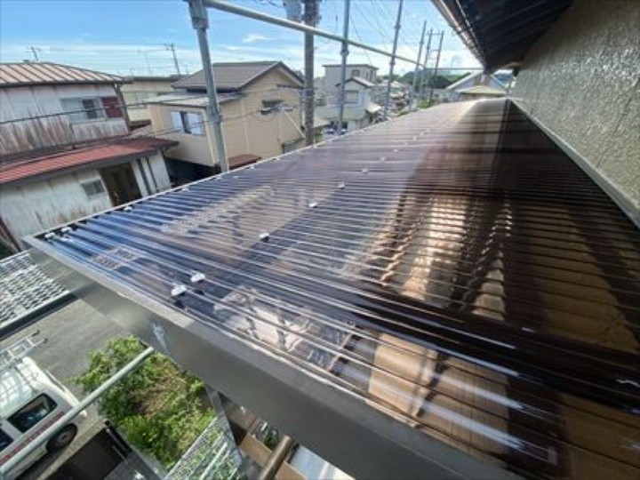 既存の波板ポリカを取り外し、雨樋の詰まりを解消したうえで、新しい波板ポリカを設置する復旧作業を進めていきました。