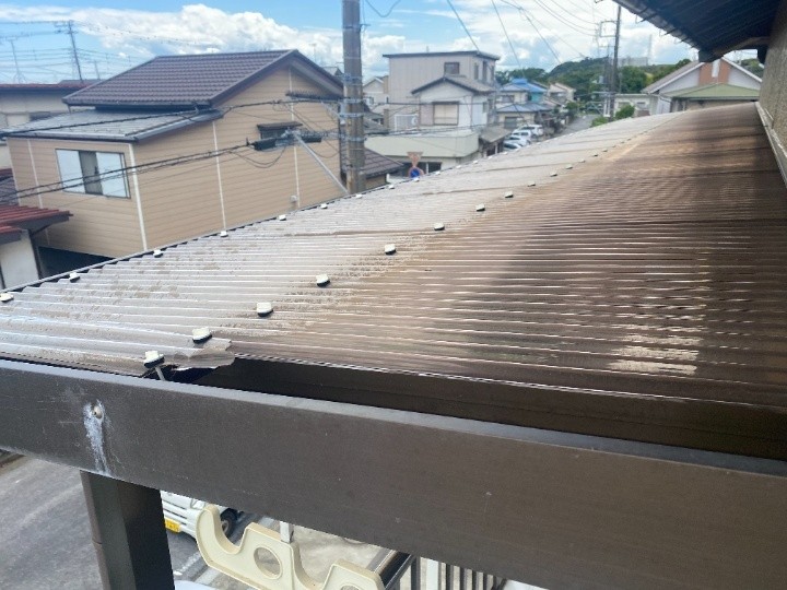 お客様の波板はポリカ製でしたが、波板を固定するフックが塩ビ製であったため経年劣化が進み、折れてしまっている箇所が確認されました。