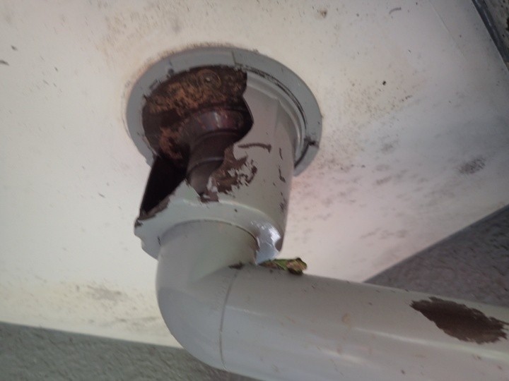 割れたベランダ下の雨樋