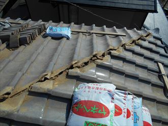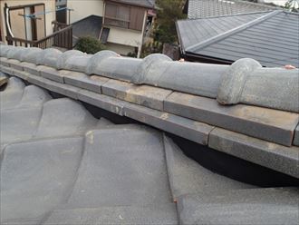 屋根に上って見ると棟瓦が大きく反っていました。