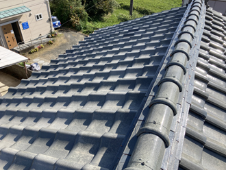 捲れてしまった瓦から下地の状況を確認したところ、防水紙の破れなどはありませんでした。切妻屋根の頂上には棟瓦があります。棟瓦も経年劣化により崩れてしまったりする危険性がありますのでメンテナンスが必要な状態か確認します。棟瓦のズレや歪みなどはありませんでした。