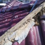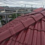 屋根には、廃盤になったセメント瓦が使用されていました。廃盤のものは入手困難な為、修繕するとなると難しいのですが、幸い、瓦に破損は見られませんでした。今回は、棟瓦取り直し工事で、棟の歪みを改善します。