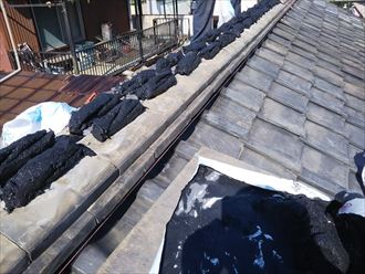 既存の棟を解体し、冠瓦やのし瓦に不具合が無いようでしたら再利用致します。解体した瓦は屋根の下に降ろしてしまうと時間が掛かり作業の効率が悪くなってしまい、工事期間が長くなってしまいますので屋根の上に仮置きしておきます。既存の棟の解体作業が終了いたしましたら、葺き土等の残土を撤去し、必ず清掃してから次の工程に移ります。
