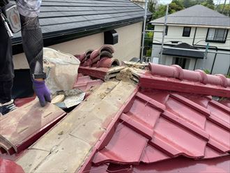 千葉市美浜区磯辺にお住まいのM様より「屋根の鬼瓦が落下してしまったので屋根を点検してほしい。」と、お問い合わせをいただき調査にお伺い致しました。調査を開始すると鬼瓦が設置されていた箇所の下部の桟瓦が割れておりました。鬼瓦が落下する過程で桟瓦を割ってしまったと考えられます。桟瓦は通常ですと瓦桟に留まっているだけですので簡単に持ち上げて差し替える事が出来ますが鬼瓦や棟の下部は持ち上げる事が出来ませんので既存の鬼瓦や棟を解体しなければ持ち上げる事が出来ませんので棟を解体する必要があります。このままですと割れている箇所から雨水が瓦の下に浸入してしまい、瓦の下に敷設されている防水紙の劣化を早めてしまいます。防水紙が劣化し、穴開きや捲れ等の不具合が発生すると雨漏りの原因になってしまいますのでお客様に調査のご報告をし、桟瓦を交換するための棟取り直し工事と瓦差し替え工事のご提案をしたところ工事のご依頼をいただきました。また、既存の棟の面戸の漆喰が剥がれている箇所がありましたので漆喰詰め直し工事のご依頼もいただきました。