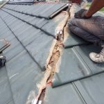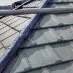 施工の様子です。割れた桟瓦を差し替える為に棟取り直し工事から行っていきます。棟取り直し工事は先ず、既存の棟を解体する工程から行います。解体する際には棟に積まれている既存ののし瓦や冠瓦に割れや欠け等の破損の有無を確認しながら解体していきます。破損していないようでしたら再利用できますので近くに仮置きし、保管しておきます。既存の棟を解体致しましたら割れた桟瓦を外す事が出来ますので差し替えます。