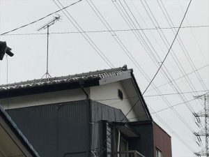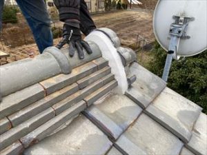 陶器製の瓦屋根の場合、塗装も必要なくメンテナンスフリーとも言われますが、この棟部分に付いては定期的なお手入れが必要です。こちらの漆喰も年数による割れや変色も見られる事から、理想としては全体の棟のメンテナンスとなる棟取り直し工事の時期に差し掛かっているとも言える状況でした。